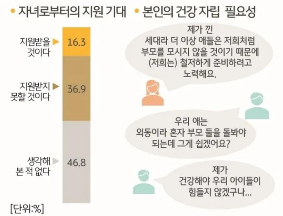 2차 베이비부머 세대는 부모를 부양하는 과정에서 건강관리의 중요성을 절감하지만, 정작 자녀를 키우고 부모를 돌보는 과정에서 자신의 건강관리에 소홀했다. 신체 건강관리를 못하고 있다는 답은 49.5%에 달했고, 정신 건강은 이보다 높은 50.3%에 이르렀다.