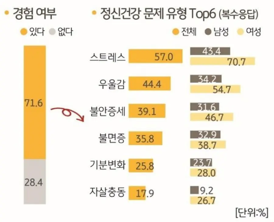 Z세대가 경험한 정신건강 문제는 취업과 직장 문제로 인한 스트레스가 가장 많았다. 응답자의 57%가 이 진로 스트레스를 꼽았다. 우울감(44.4%), 불안감(39.1%) 등이 뒤를 이었다.