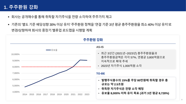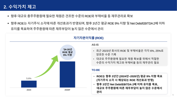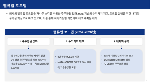 중장기 영업이익률을 12% 이상으로 가져가고, 올해부터 내년까지 3개년 간 평균 총주주환원율을 40% 이상 달성하겠다고 밝혔다. 또 3년 평균 ROE 9% 이상 목표도 제시했다.