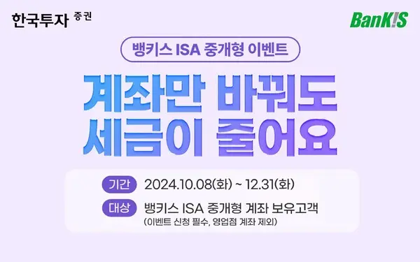|스마트투데이=김세형 기자| 한국투자증권(사장 김성환)은 오는 12월 말까지 뱅키스 고객을 대상으로 중개형 ISA(개인종합자산관리계좌) 이벤트를 진행한다고 10일 밝혔다. 뱅키스는 비대면 또는 시중은행을 통해 개설하는 한국투자증권 온라인 전용 계좌 및 거래 서비스다.