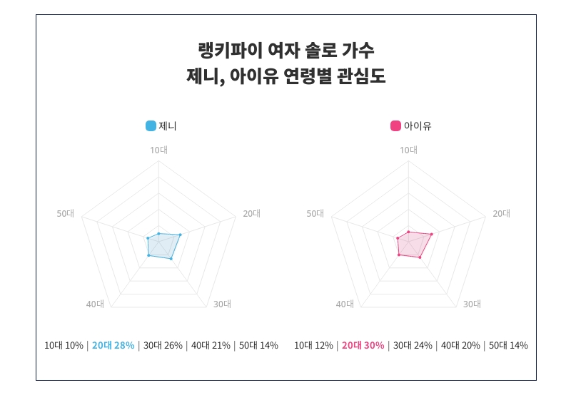 또한 제니와 아이유 사이에서 연령별 관심도 분포가 뚜렷이 나타났다. 제니는 20대에서 28%로 가장 높은 관심도를 보여주며, 10대 10%, 20대 28%, 30대 26%, 40대 21%, 50대 14% 순으로 연령대별 관심 분포가 나타났다.