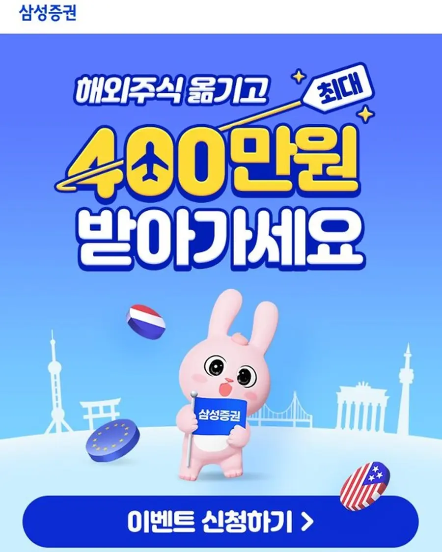 |스마트투데이=김세형 기자| 삼성증권은 타사 해외주식을 삼성증권으로 대체 순입고한 고객을 대상으로 최대 400만원 리워드를 지급하는 이벤트를 31일까지 진행한다고 11일 밝혔다.