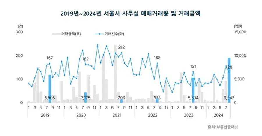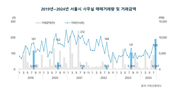 |스마트투데이=이재수 기자| 상업용 부동산 전문 프롭테크 기업 부동산플래닛이 11일 발표한 '8월 서울 오피스 매매 및 임대 시장 동향'에 따르면, 8월 매매된 오피스빌딩은 총 8곳으로, 7월의 6곳에서 2곳이 늘었다. 반면 거래금액은 전월 6668억원에서 26% 감소한 4931억원으로 집계됐다.