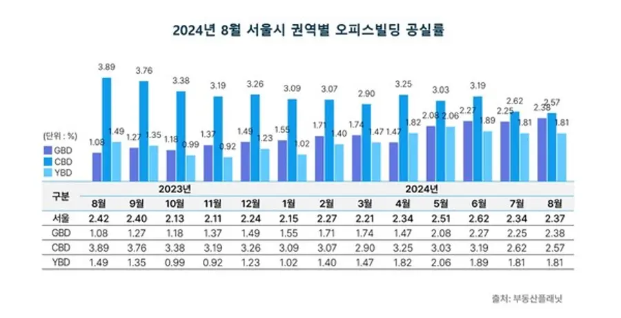 오피스 공실률은 2.37%로 전월과 큰 차이가 없었으며, CBD(중구, 종로구)의 공실률이 소폭 감소하고, GBD(강남구, 서초구)는 소폭 증가했다.