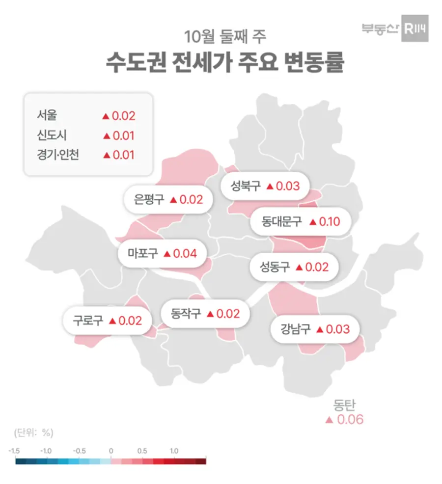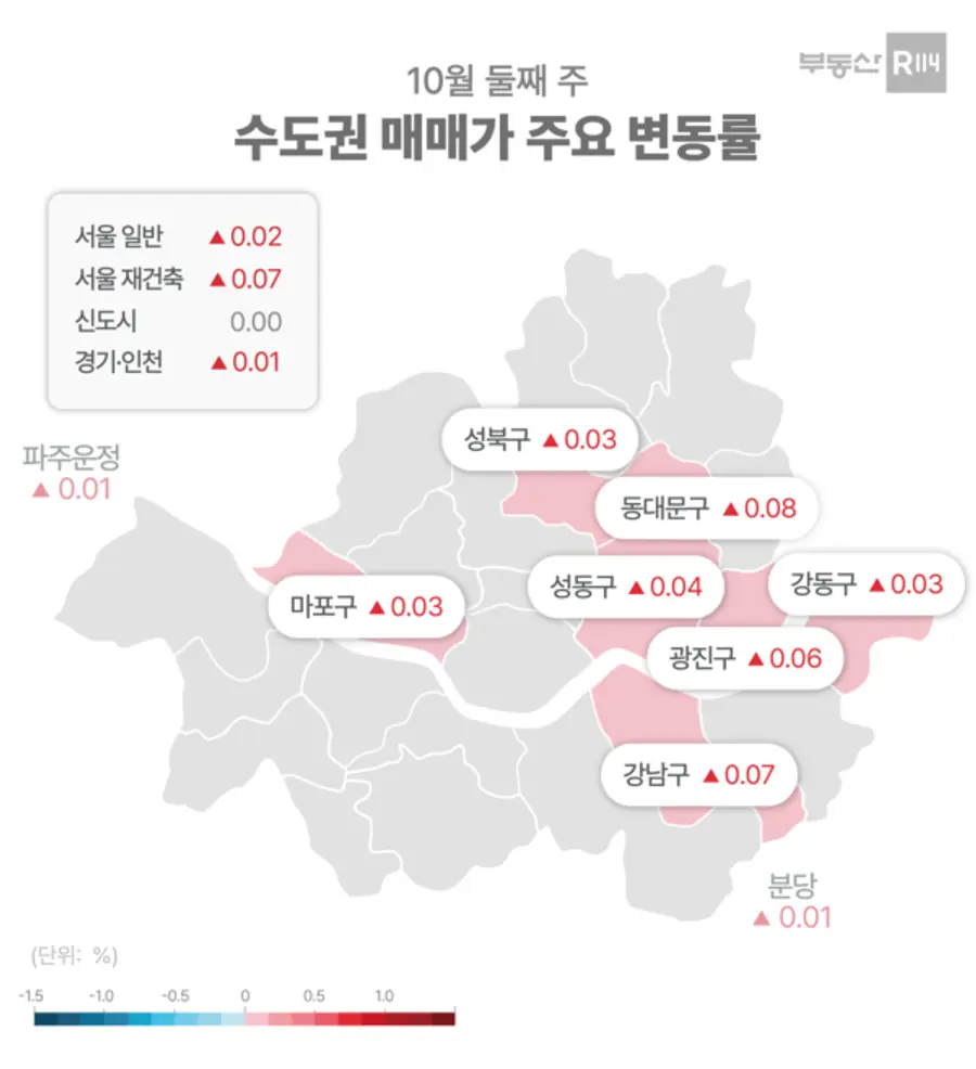 서울 전체 25개구 중 하락지역이 전무한 가운데 동북권 대단지 아파트와 강남권 정비사업 추진단지 위주로 오름폭이 두드러졌다 특히 동대문구가 0.08%로 가장 큰 상승폭을 보였고, 강남구(0.07%), 광진구(0.06%) 등이 뒤를 이었다.