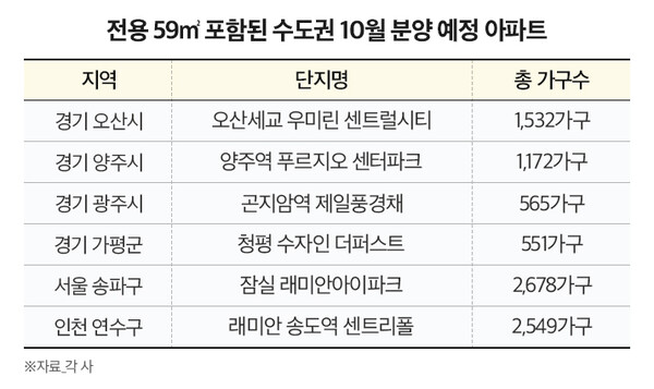 이런 가운데 대규모 분양물량이 예고된 10월 수도권 분양시장에는 전용면적 59㎡ 타입을 구성해 선보이는 새 아파트가 잇따라 공급돼 많은 관심이 이어지고 있다.