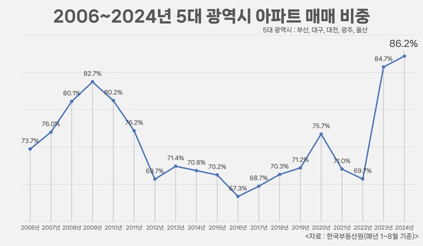 5대 광역시 아파트 매매 비중은 지난 2020년 75.7%, 2021년 71.0%, 69.7%으로 하락했다가 지난해 84.7%로 상승했고, 올해 역대 최고 비중을 보였다.