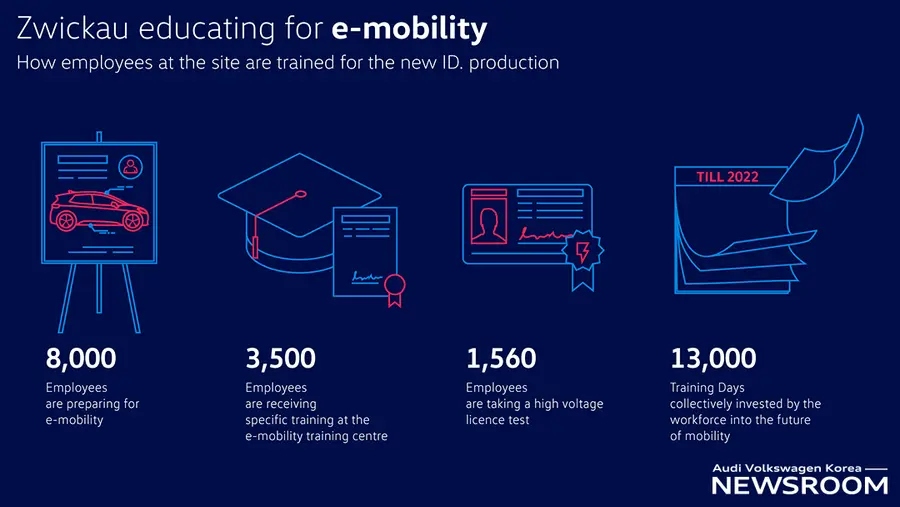 계획을 실현하기 위해 츠비카우 공장에서 준비가 진행되고 있다. E-모빌리티 교육이 바로 그것이다. 새로운 ID시리즈 생산 과정에서 8,000명의 직원은 E-모빌리티를 위한 준비를 하고 있으며 3,500명의 직원은 E-모빌리티 훈련 센터에서 특별한 교육을 받고 있다. 한편, 1,560명의 직원은 고전압 라이센스 테스트를 받고 있다. 이들은 교육을 위해 특별히 설립된 200제곱미터의 고전압 실험실을 사용하며, 디지털 교육 및 VR 고글을 통해 실제 제품 생산 프로세스에 대한 배우게 된다. 모빌리티의 미래로 향하는 근로자들에 의해 2022년까지 13,000일의 훈련 기간을 달성하게 된다.
