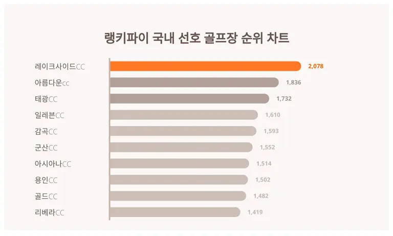 랭키파이에 따르면 10월 2주차 기준 국내 선호 골프장 트렌드지수 1위는 레이크사이드CC, 2위는 아름다운cc이다.