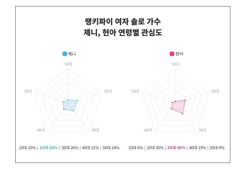 또한 제니와 현아 사이에서 연령별 관심도 분포가 뚜렷이 나타났다. 제니는 20대에서 28%로 가장 높은 관심도를 보여주며, 10대 10%, 20대 28%, 30대 26%, 40대 21%, 50대 14% 순으로 연령대별 관심 분포가 나타났다.