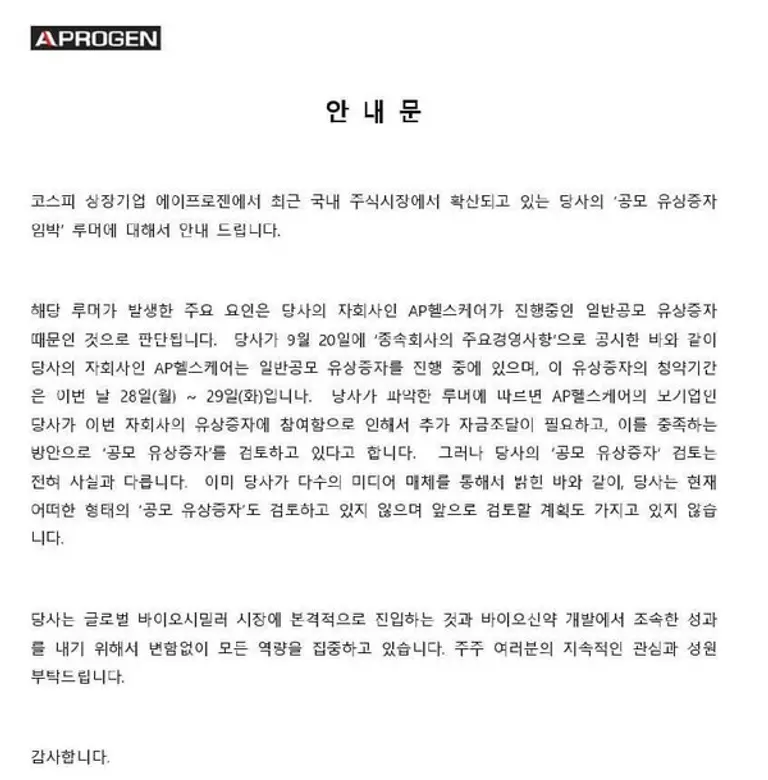 에이프로젠은 "해당 루머가 발생한 주요 요인은 자회사인 AP헬스케어가 진행 중인 일반공모 유상증자 때문인 것으로 판단된다"고 밝혔다.