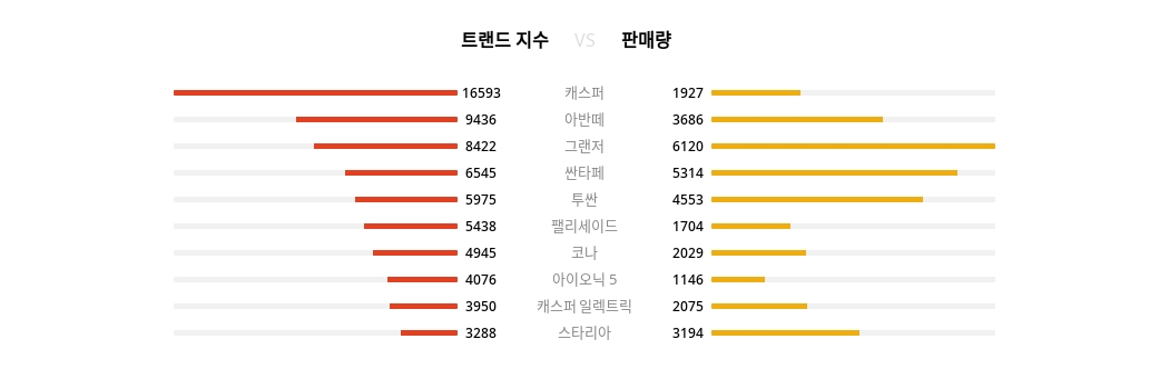 | 1 | 캐스퍼 | 16,593 | 16,461 | 132 | 0.80% | 1,927 |
