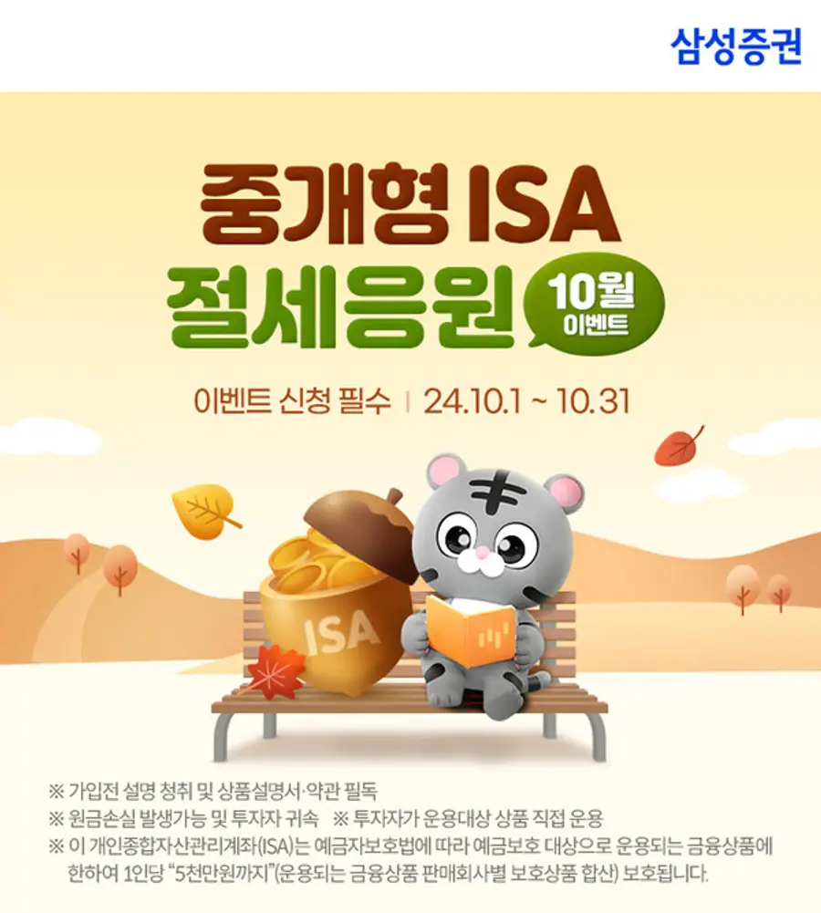 |스마트투데이=김세형 기자| 삼성증권이 중개형 ISA 계좌 보유 고객 대상으로 최대 상품권 25만원을 지급하는 이벤트를 10월 말까지 실시한다고 23일 밝혔다.