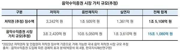 또 음악수익증권 발행을 통해 형성된 15조1080억원의 자본이 음악 시장에 투입된다면 62만9500곡이 새롭게 창작될 수 있고, 새롭게 창작된 음반을 통해 3년간 5700억원의 저작권료 수입을 올릴 수 있다고 추정했다.