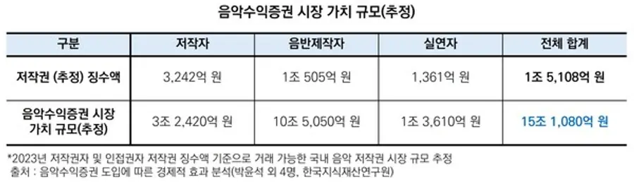 지재연의 추정에 따르면, 현재 발매된 국내의 음악저작권이 모두 음악수익증권으로 발행될 경우에 시장 가치 규모는 15조1080억원이다.