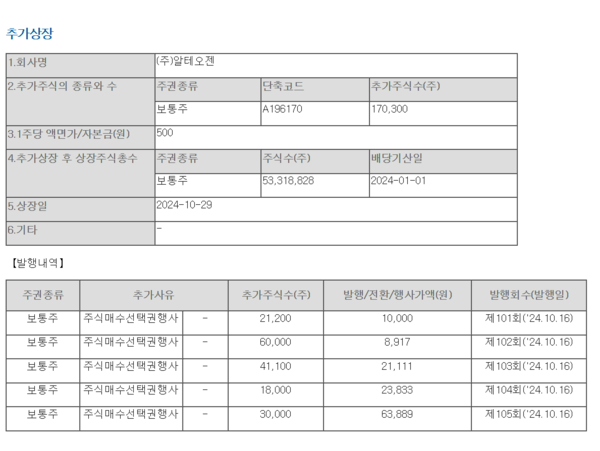 알테오젠은 지난 24일 지난 16일자로 스톡옵션 행사에 따라 17만주가 발행돼 오는 29일 상장될 예정이라고 공시했다.