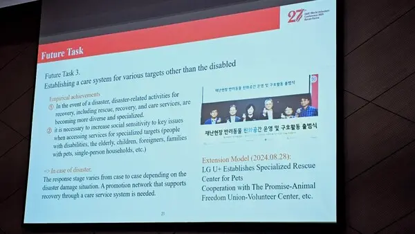 이 국장은 “재난이 발생하면 이재민구호에서 반려동물가족을 구호하고 쉼터를 마련하기 위한 협약을 가졌다”라며 “이 협약은 LG유플러스, 더프라미스, 동물자유연대 등이 참여하였고 현재 LG유플러스는 강원도 산불 때 동물구호소를 운영했다”라고 설명했다.