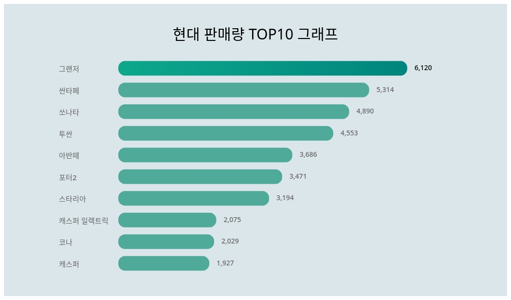 더불어 판매량 1위는 그랜저가 6,120대의 판매량을 기록했다. 또한 2위 싼타페, 3위 쏘나타, 4위 투싼, 5위 아반떼 순으로 나타났다.