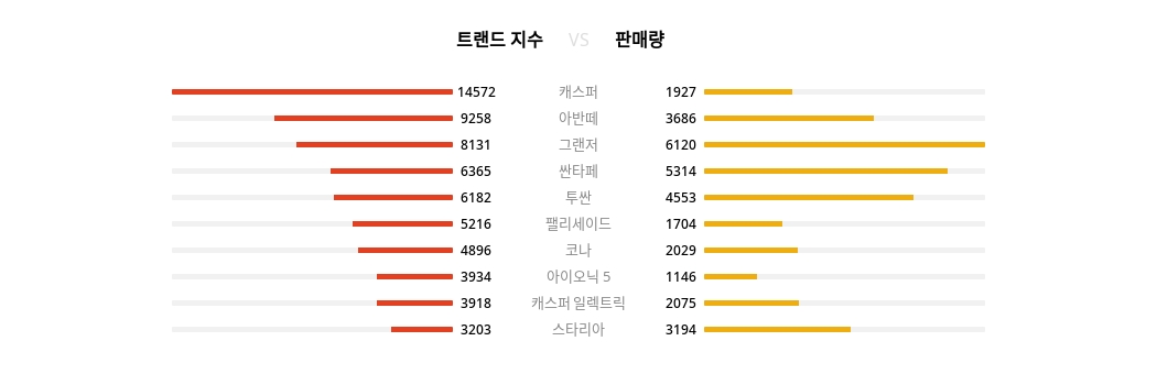 | 1 | 캐스퍼 | 14,572 | 16,593 | -2,021 | -12.18% | 1,927 |