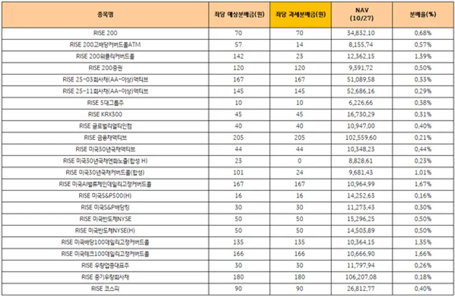 [표] KB자산운용 RISE ETF 10월 분배금 내역