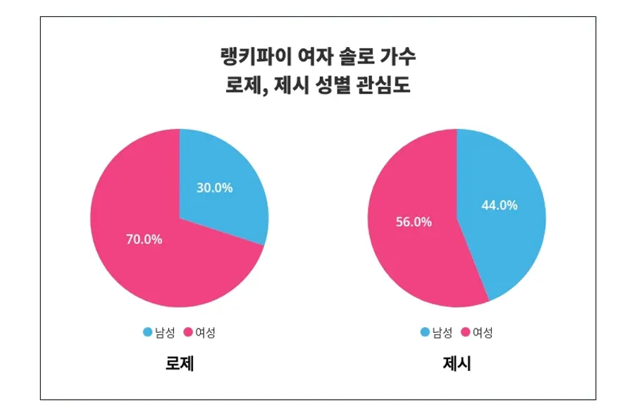 성별 관심도 조사 결과, 로제는 '여성'에서 '70%'로 남성보다 높은 관심을 받는 것으로 나타났다.