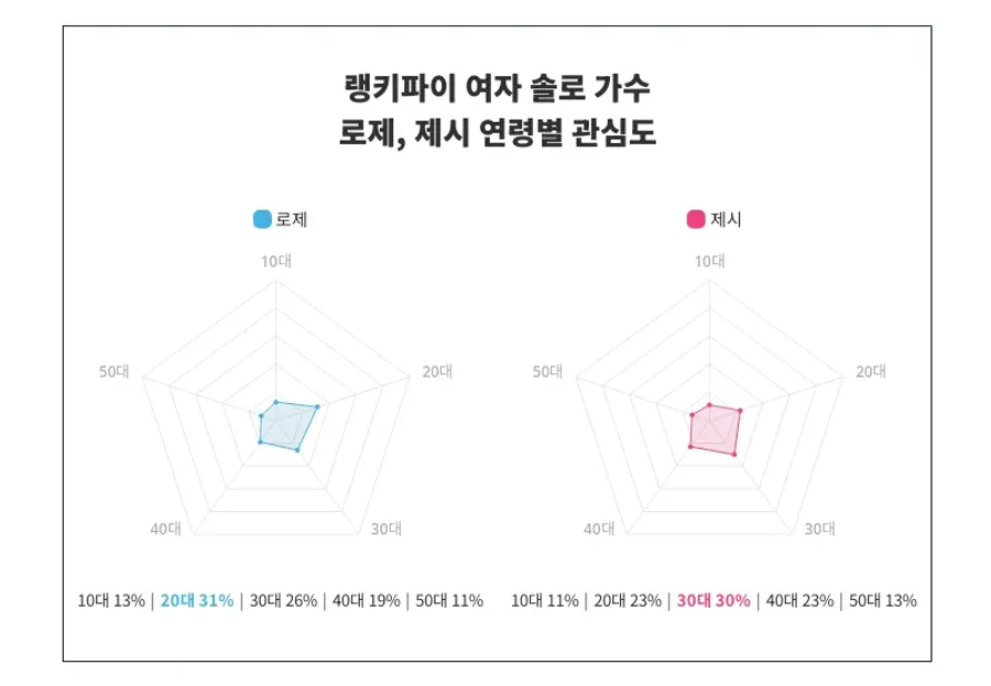또한 로제와 제시 사이에서 연령별 관심도 분포가 뚜렷이 나타났다. 로제는 20대에서 31%로 가장 높은 관심도를 보여주며, 10대 13%, 20대 31%, 30대 26%, 40대 19%, 50대 11% 순으로 연령대별 관심 분포가 나타났다.