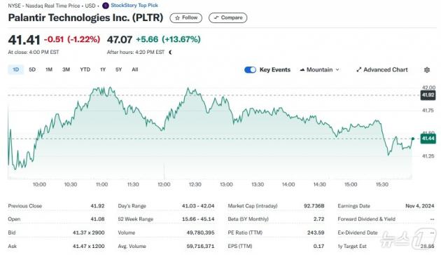 뉴스1에 따르면 4일(현지시간) 뉴욕증시 시간외거래에서 팔란티어(Palantir)는 13.67% 폭등한 47.07달러를 기록하고 있다. 앞서 정규장에서는 1.22% 하락, 마감했다.