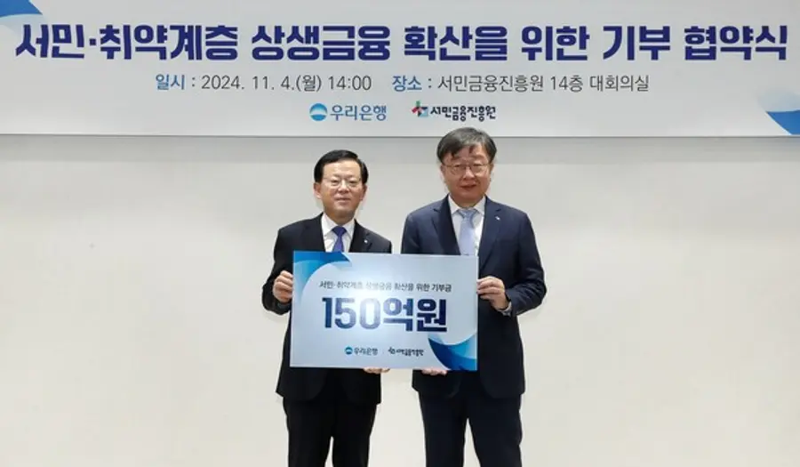 |스마트투데이=김국헌 기자| 우리은행이 취약계층 대출을 지원하기 위해 서민금융진흥원에 기부금 150억원을 출연했다고 5일 밝혔다.