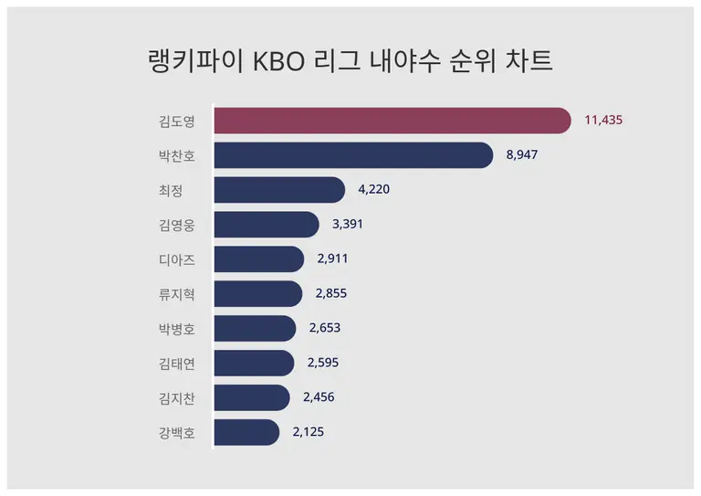 | 3 | 최정 | 4,220 | 3,175 | 1,045 | 32.9% |