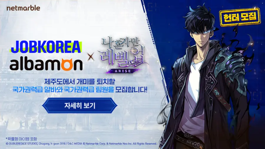 |스마트투데이=이주영 기자| 넷마블(대표 권영식, 김병규)은 액션 게임 '나 혼자만 레벨업:어라이즈'(개발사 넷마블네오)가 대표 커리어 플랫폼 잡코리아, 알바몬과 협업을 통해 오는 12월 업데이트 예정인 ‘제주도 레이드’에 참가할 헌터를 공개 모집한다고 8일 밝혔다.