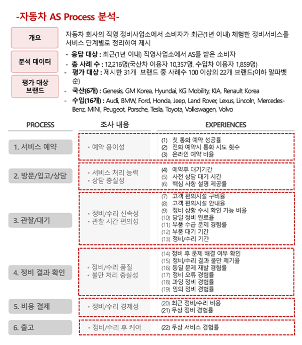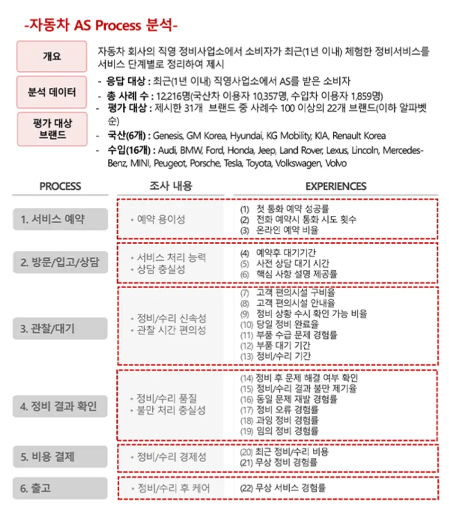한편, 정비 결과 확인 등 사후서비스에서 국산차에 비해 수입차 운전자들의 만족도가 상대적으로 높았다. 특히 렉서스는 정비수리결과 불만제기율 6%와 동일문제 재발경험률(2%)로 가장 낮았다. 볼보는 정비후 문제 해결 여부 확인에서 92%의 높은 만족도를 보였다. 정비오류는 푸조(Peugeot)가 가장 낮았고, 과잉정비에서는 제네시스, 임의정비 항목에서는 볼보(Volvo)가 각각 제일 낮아 소비자 만족도가 상대적으로 높게 나타났다.
