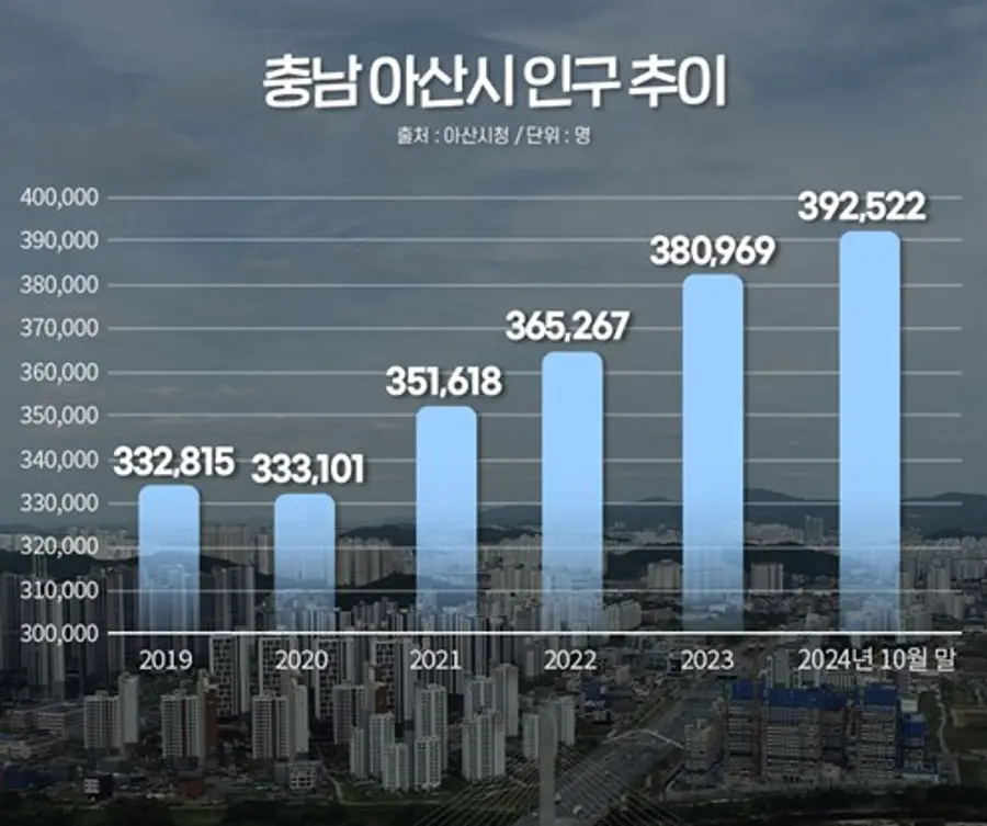 |스마트투데이=이재수 기자| 지방 지차체들이 인구소멸을 우려하는 가운데 충남 아산시 인구가 빠르게 늘고 있어 눈길을 끈다. 아산시는 청년층이 유입되면서 매년 1만 명씩 인구가 증가하며 활력을 띠고 있다.