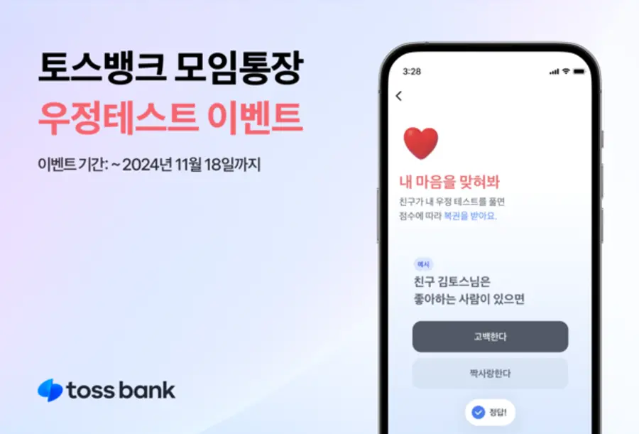 |스마트투데이=김국헌 기자| 인터넷 전문은행 토스뱅크가 오는 18일까지 ‘우정테스트 하고 복권받기’ 모임통장 이벤트를 한다고 13일 밝혔다.