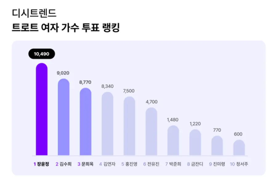 장윤정은 10,490의 참여지수로 1위를 차지했다. 오랜 시간 트로트 여왕으로 자리매김한 그녀는 여전히 막강한 팬덤을 보유하고 있으며, 이번 투표에서도 그 영향력을 입증했다.