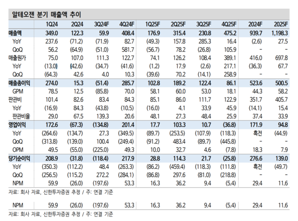 알테오젠에 가장 강력한 신뢰를 표시하고 있는 신한투자증권 엄민용 연구원은 지난 13일 73만원 목표주가 상향 보고서에서 지난 3분기 매출과 영업이익을 각각 59억9000만원, 134억8000만원 적자로 추정했다.