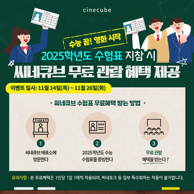 12월 11일부터 연말까지 수험표를 제시하면 평일 6000원, 주말 7000원의 할인가 혜택이 제공된다. 이 기간에는 △이처럼 사소한 것들(감독 팀 말란츠, 주연 킬리언 머피) △아들들(감독 구스타브 몰러, 주연 시드바벳 크누센) △더 폴(The Fall)(감독 타셈 싱, 주연 리 페이스) 등이 상영 예정이다.