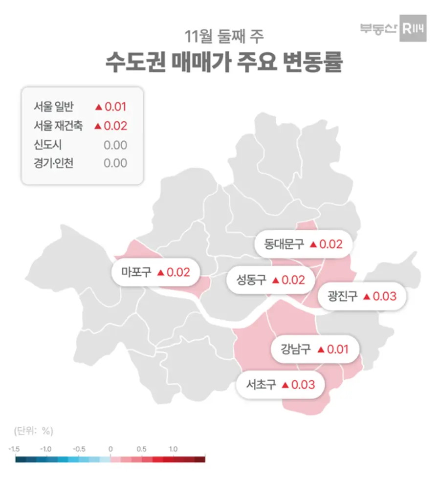 금주 서울 아파트 매매가격은 전주 대비 0.02%p 둔화되며 0.01% 상승했다. 재건축이 0.02%, 일반아파트는 0.01% 올랐다. 신도시와 경기·인천은 보합(0.00%) 수준에서 제한적인 움직임을 나타냈다.