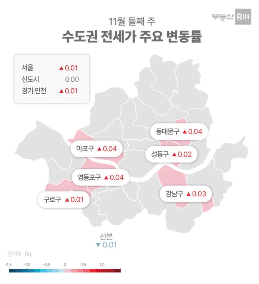 전세가격은 강보합 수준에서 제한적인 움직임을 나타냈다. 서울은 전주 대비 0.01% 올랐고, 신도시는 보합(0.00%), 경기·인천은 0.01% 상승했다. 전세보증금 대출에 대해서도 주요 은행권들이 개별 차주의 조건(주택 소유여부, 소유권 등기 여부 등)을 과거보다 까다롭게 평가하고 있어 유동성이 줄어드는 분위기다.