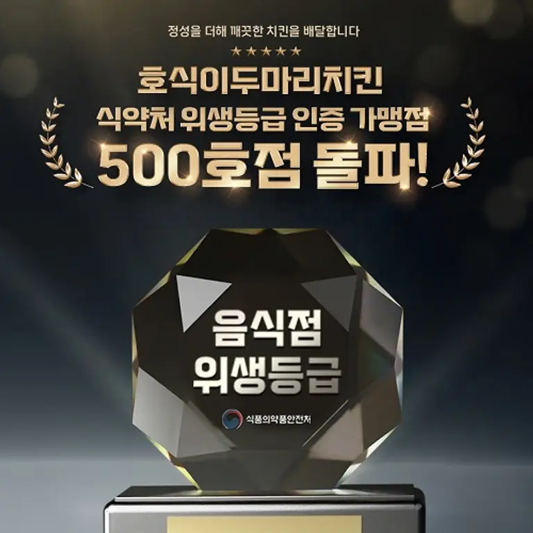 호식이두마리치킨은 "철저한 위생관리로 깨끗하고 안전한 치킨을 제공해 고객만족을 높이고자 매장별 위생등급을 추진해오고 있다"며 "호식이두마리치킨 위생등급 획득 비율은 70% 로 이는 업계 최고 수준"이라고 밝혔다.