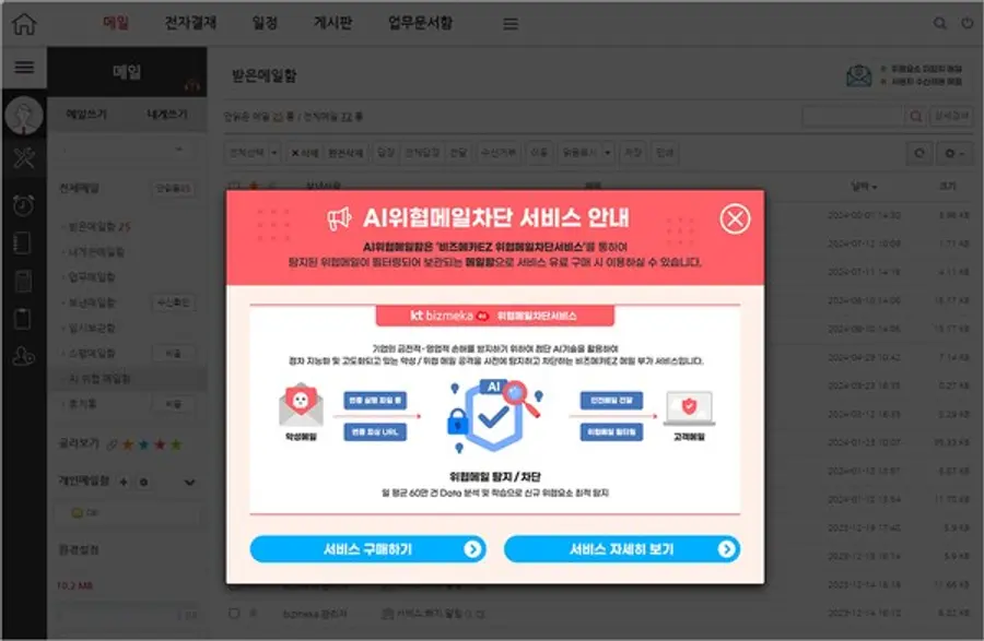 AI위협메일 차단서비스는 KT의 빅데이터 기반 AI기술로 외부 악성 이메일 공격을 사전에 탐지하고 차단할 수 있다.