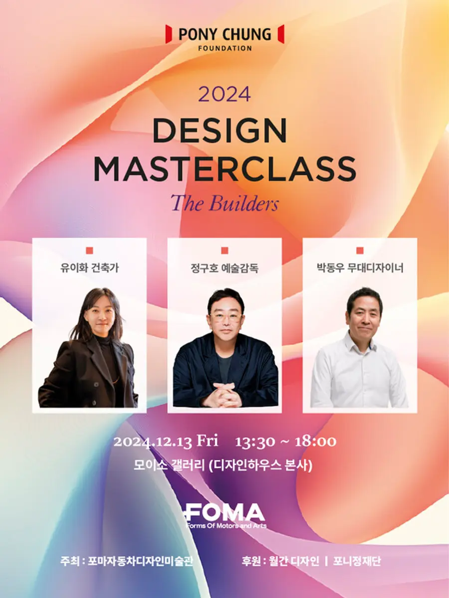 제3회 포니정 디자인 마스터클래스는 12월 13일 오후 1시부터 6시까지 서울 장충동에 위치한 디자인 전문 갤러리 ‘모이소’에서 진행된다. 참가 신청 및 행사에 대한 자세한 정보는 포니정재단과 FOMA 공식 인스타그램과 홈페이지에서 확인할 수 있다.