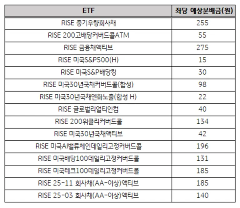 RISE 미국배당100데일리고정커버드콜은 131원, RISE 미국AI밸류체인데일리고정커버드콜은 196원을 분배한다.