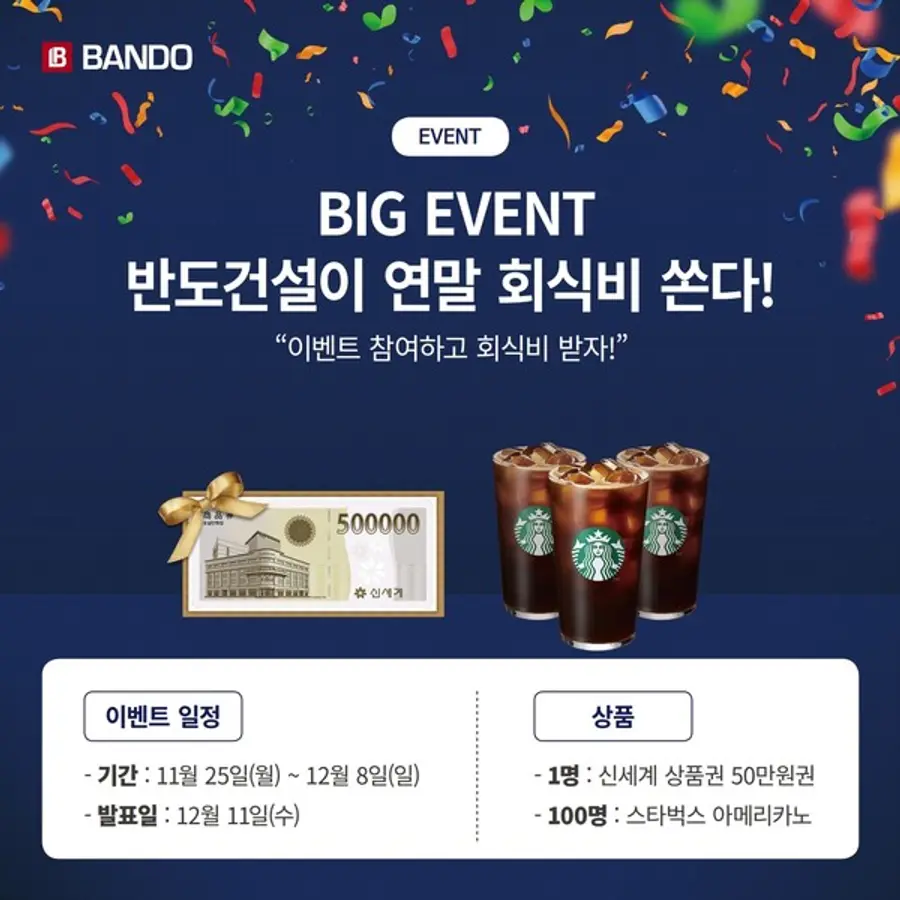 반도건설 공식 인스타그램 계정을 팔로우한 후 올해를 함께 마무리하고 싶은 동료, 동호회, 친구, 가족을 태그한 뒤 경품이 필요한 이유를 댓글로 작성하면 이벤트에 참여된다. 이벤트 기간 중 응모한 사연의 내용을 검토해 당첨자를 선발하며 소식을 나누고 태그한 사람이 많을수록 당첨 확률이 높아진다.
