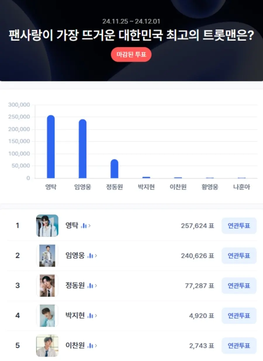 디시트렌드가 11월 25일부터 12월 1일까지 실시한 ‘대한민국 최고의 트롯맨’ 투표에서 영탁이 257,624표를 얻으며 압도적 1위를 차지했다. 이번 투표는 트로트 팬들 사이에서 큰 관심을 받으며 총 400,000표 이상의 참여를 이끌어냈다.