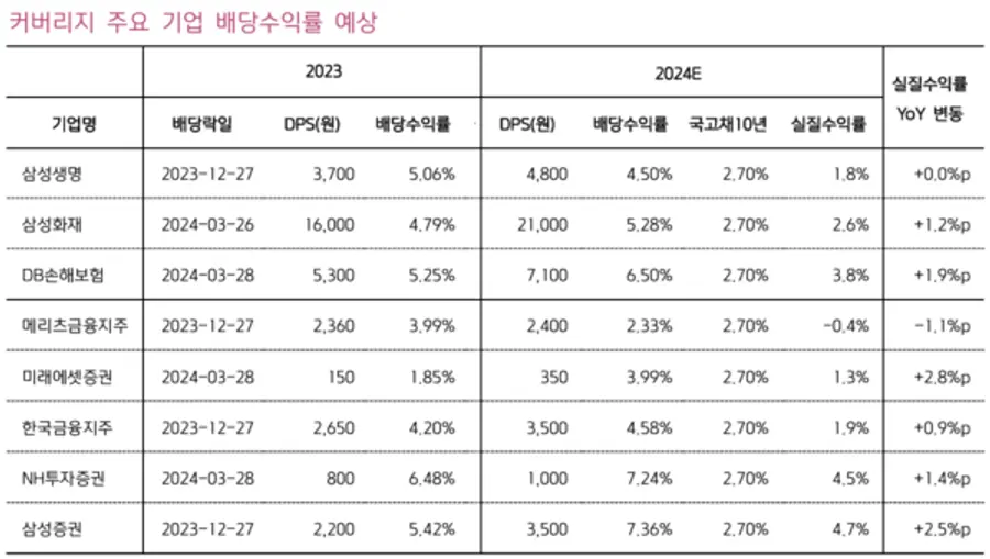 키움증권은 올해 실질수익률 전망치가 높은 보험·증권주로 삼성증권(4.7%), NH투자증권(4.5%), DB손해보험(3.8%) 등을 꼽았다. 이는 국고채 10년물 금리 2.7%보다 높다.