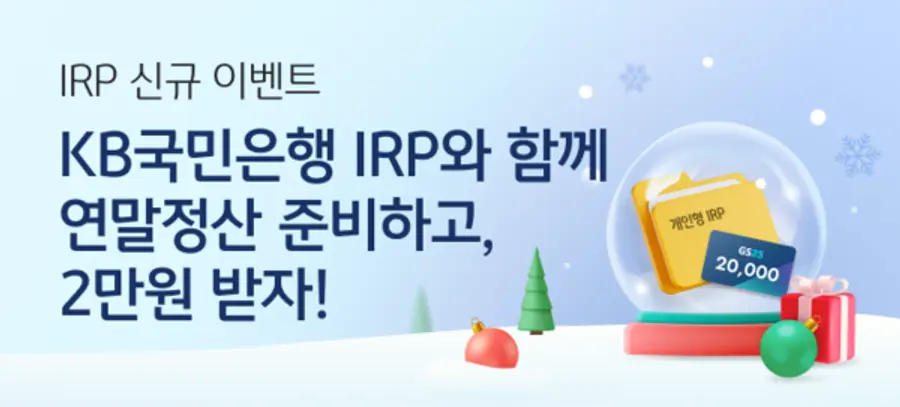 이벤트 기간에 개인형 IRP에 처음 가입하고, 300만원 이상 입금하면, 선착순 5,000명에게 GS25 편의점 모바일 상품권 2만원권을 제공한다.