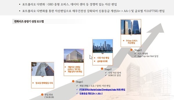 한화리츠는 설명회에서 "향후 GBD 중형 오피스, 데이터 센터 등 경쟁력 있는 자산의 추가 편입과 子리츠 설립을 통한 추가 자산 편입시 (증자 대신) 회사채 발행으로 자금을 모을 것"이라고 밝혔다. 특히 "회사채 발행을 통해 레버리지 효과를 극대화하고, 母리츠 당기순이익 개선과 특별 배당을 계획 중"이라고 말했다.