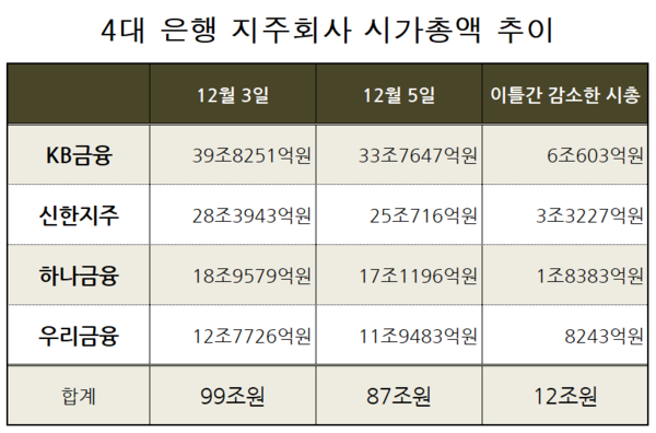 |스마트투데이=김국헌 기자| 12월 3일 밤 계엄령 사태로 4대 은행 금융지주 시가총액이 12조원 넘게 증발했다.