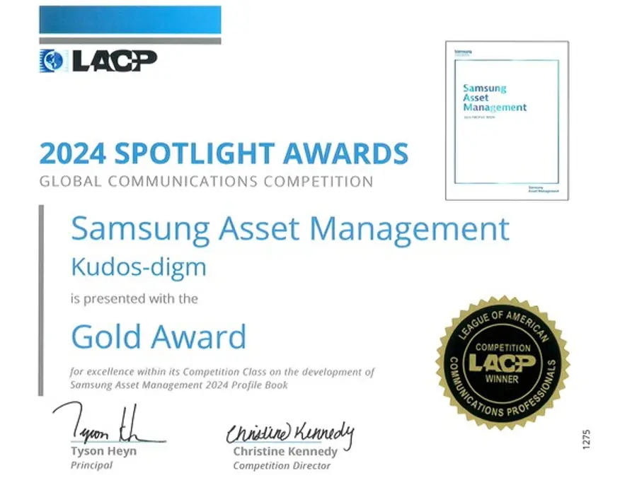 |스마트투데이=김윤진 기자| 삼성자산운용은 '2024년 삼성자산운용 프로파일북'이 미국 커뮤니케이션 연맹(LACP)이 주관하는 ‘2024 LACP 스포트라이트 어워드에서 금상을 수상했다고 12일 밝혔다.