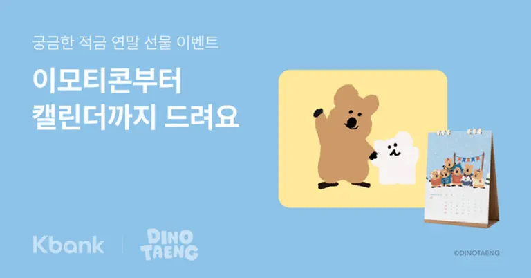 케이뱅크는 10만좌 돌파를 기념해 연말까지 ‘궁금한 적금’에 가입한 고객 선착순 3만명에게 인기 캐릭터 ‘다이노탱(DINOTAENG)’ 캘린더와 카카오톡 이모티콘을 지급하는 프로모션을 진행한다.